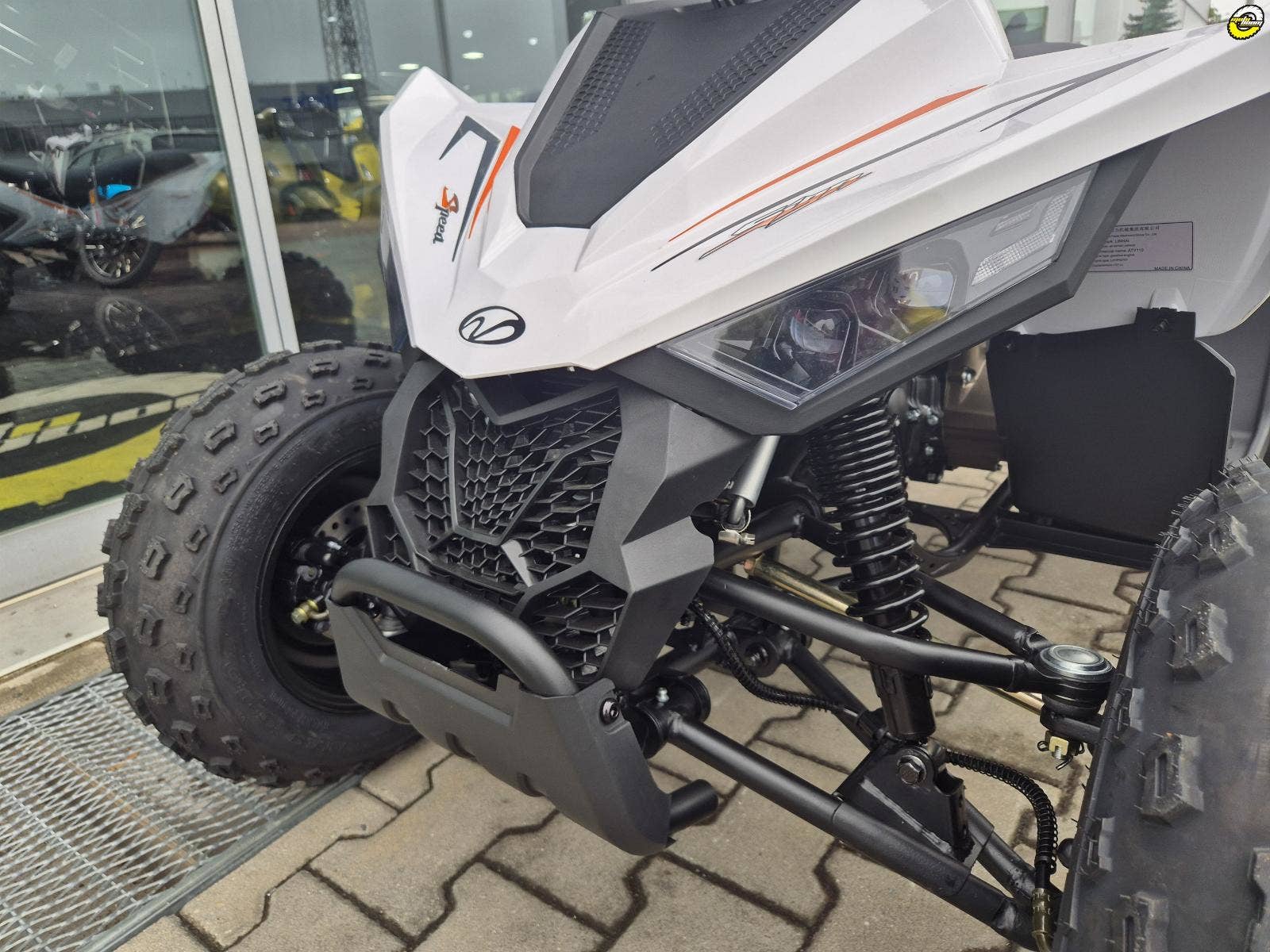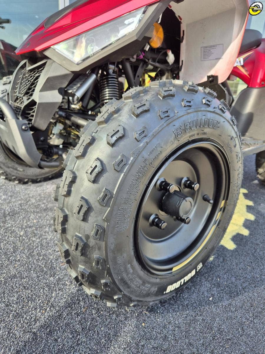 Čtyřkolka je poháněna zadními koly s rovnoměrným přenosem výkonu přes řetěz. Přední odpružení je postaveno na A-ramenech s progresivními pružinami a nastavitelným předpětím v pěti pozicích. Vzadu se nachází centrální tlumič, který umožňuje také nastavení tuhosti.