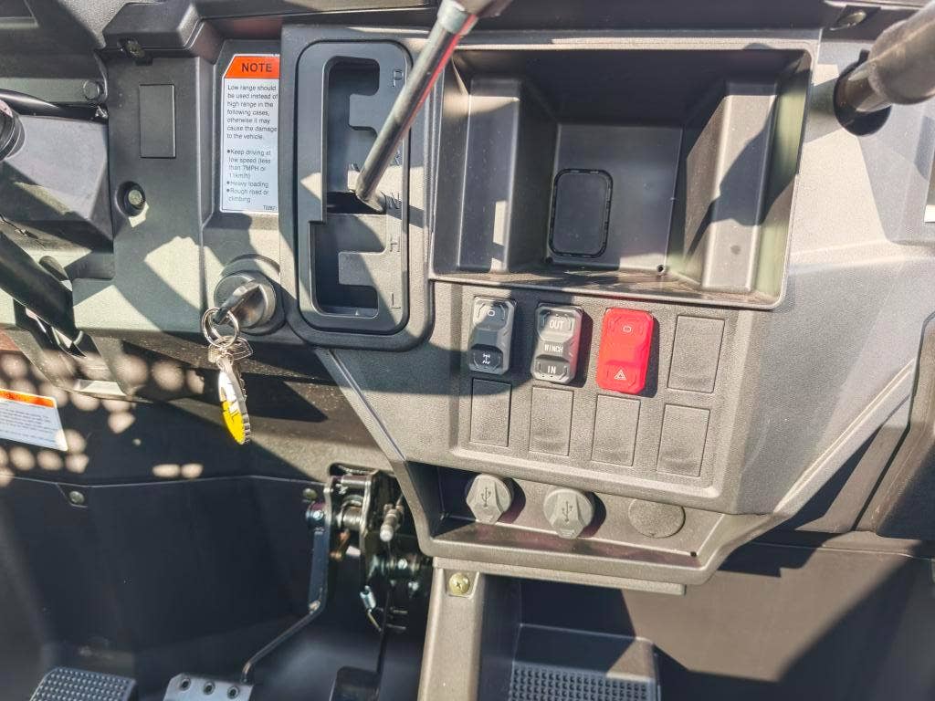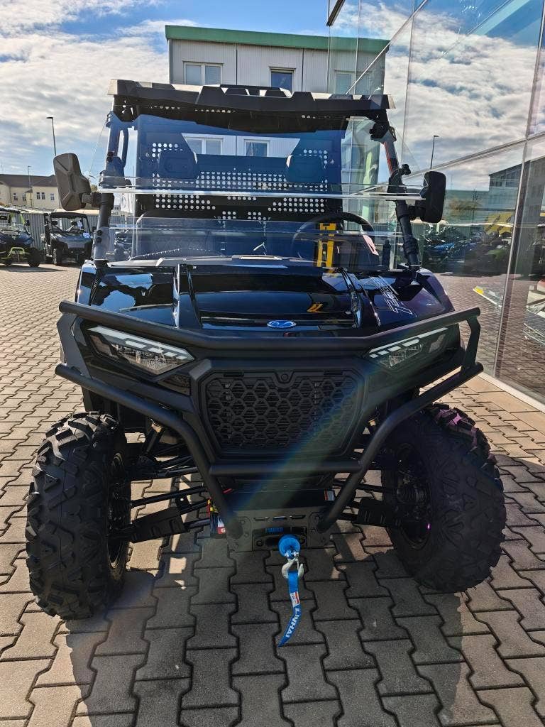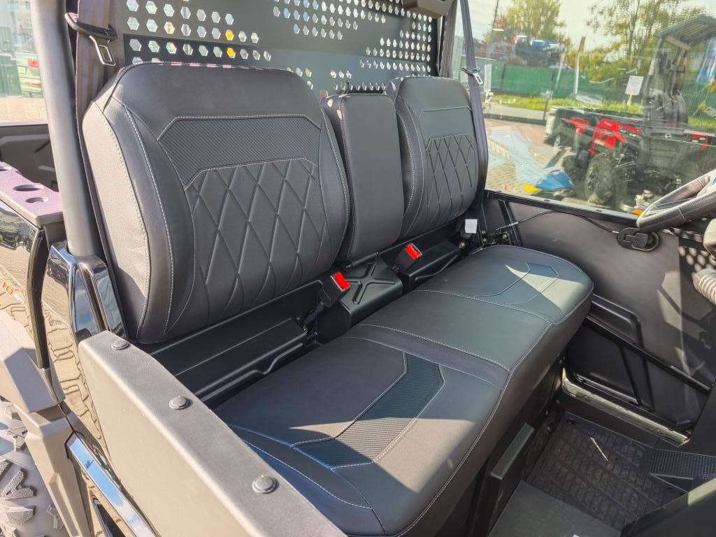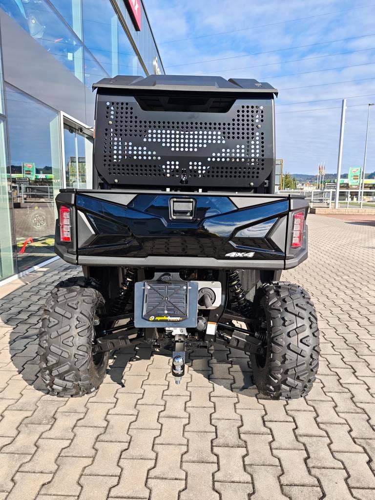 Elektrický posilovač řízení, poloviční plastové dveře, pevná plastová střecha, třímístné lavicové sedadlo s bezpečnostními pásy, výškově nastavitelný volant, plné čelní plexi, přední ochranný rám, madla pro spolujezdce, sklápěcí korba s plynovými vzpěrami, hlavové opěrky, 2 držáky nápojů ve středové konzoli, homologované tažné zařízení, elektrický naviják 3000lbs s dálkovým ovládáním (syntetické lano)
